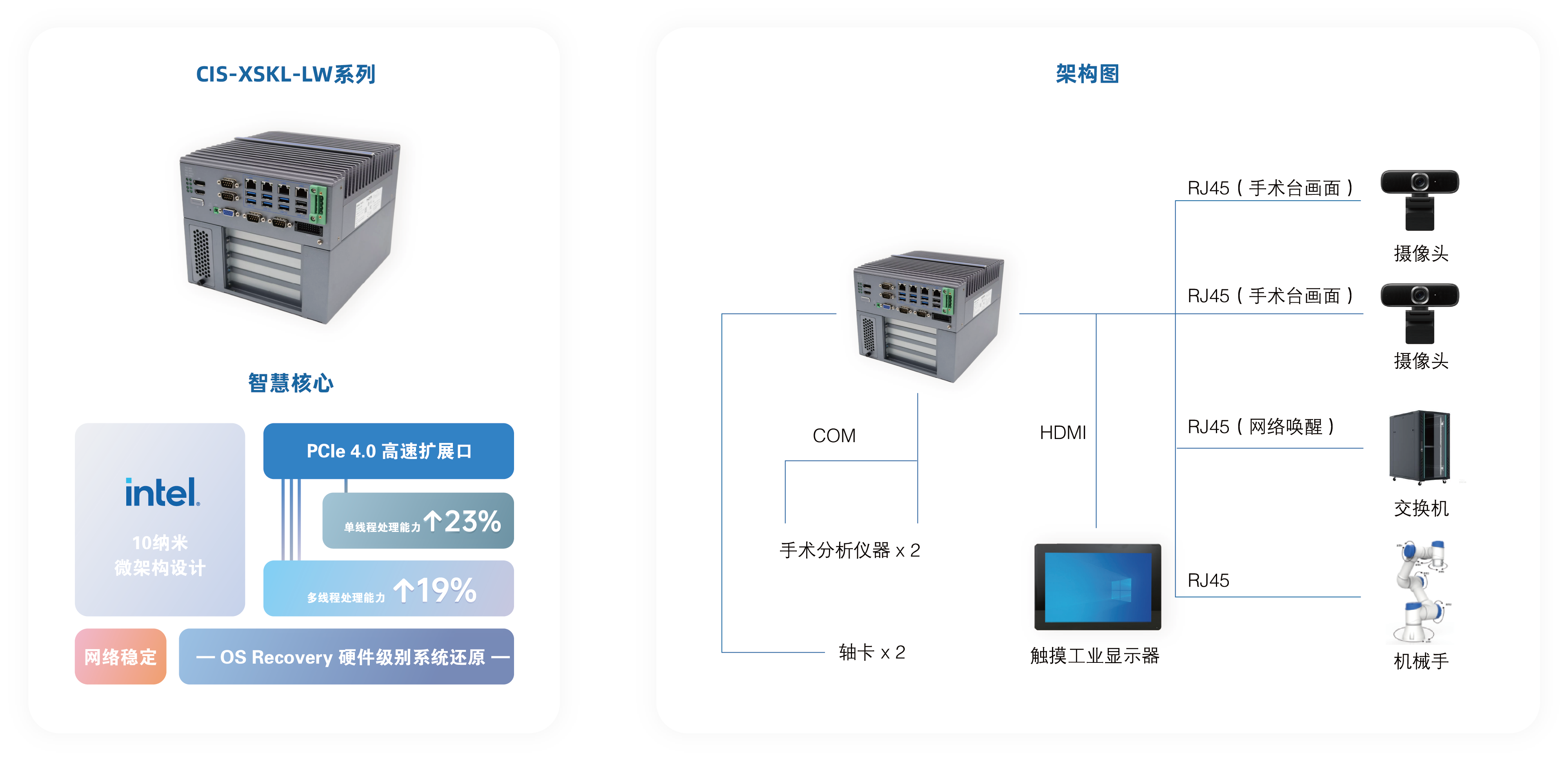 产品支持4个Intel®千兆网口,数据传输高速稳定。用户通过其实现外接网络交换机、配备机械手臂的手术车、2台高清相机,为手术室WOL局域网网络唤醒、机械手臂操控、手术台及手术室视频拍摄、存储、传输等提供稳定网络环境,减少数据丢包;
